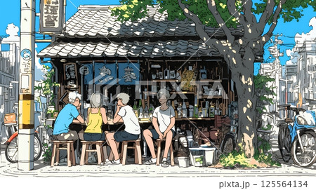 昭和の匂いがする昔ながらの飲み屋(クレヨンと水彩画風)