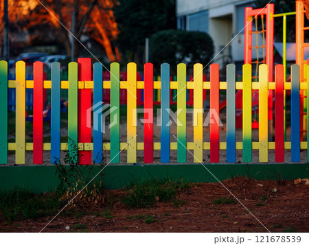 The colorful painted wooden boards on the fence around a playground are illuminated by the rays of the setting sun. Pula, Croatia - January 3, 2025