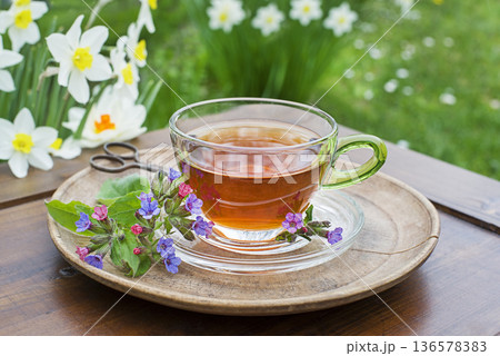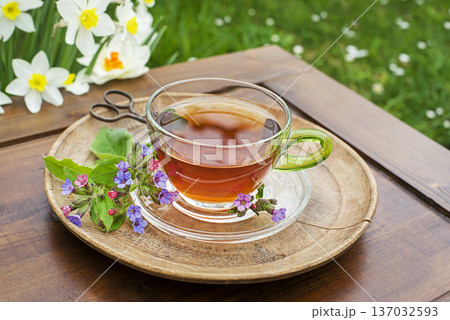 Cup of lungwort (pulmonaria) tea with fresh plant