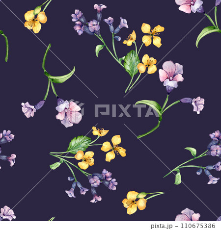 Medicinal plants watercolor seamless pattern isolated on dark background. Pulmonaria officinalis purple flower hand drawn. Painted celandine herb plant. Design for label, package, textile, wrapping