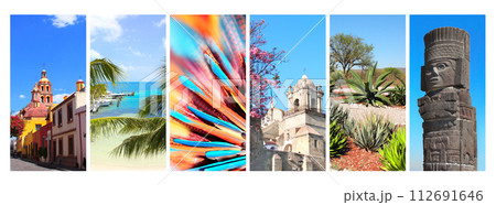 Collection of vertical banners with famous landmarks of Mexico. Cathedral in Puebla, Historic medieval houses in Queretaro, atlantean in Tula, cactus garden, sand beach and Caribbean sea in Cancun