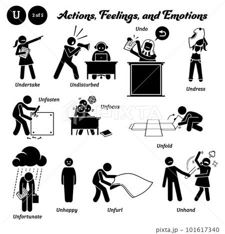 Stick figure human people man action, feelings, and emotions icons alphabet U. Undertake, undisturbed, undo, undress, unfasten, unfocus, unfold, unfortunate, unhappy, unfurl, and unhand.