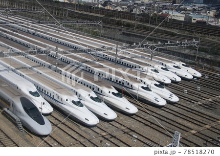 大阪モノレール下り線側から新幹線車両が並ぶ絶景ポイント、東海道新幹線鳥飼基地を車中より望む
