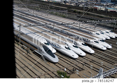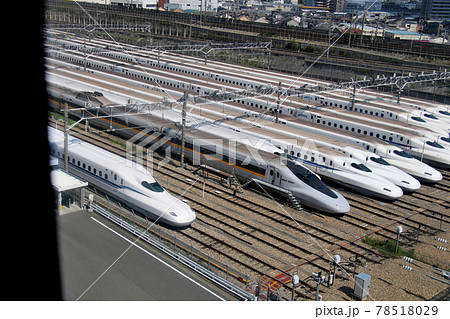 大阪モノレール下り線側から新幹線車両が並ぶ絶景ポイント、東海道新幹線鳥飼車両基地を車中より望む