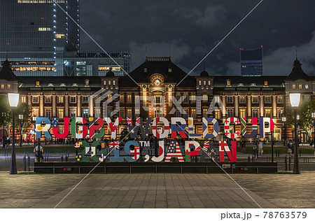 ラグビーワールドカップ2019ジャパンのオブジェと東京駅 (昼間) 【東京都東京駅にて】