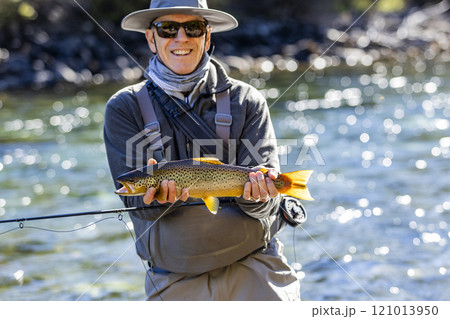 Portrait of smiling fly-fisherman holding native brown trout from Traful River before releasing it unharmed