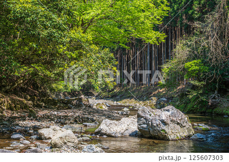 針葉樹林の間を流れる清流 鞍馬川 京都市