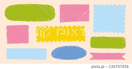 Doodle brush crayon shape color frame set. Hand drawn crayon pencil box, pastel rough chalk texture square border. Cute cartoon paint frame circle, square background design. Vector