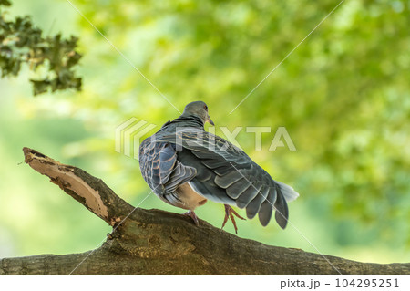 枝にとまり羽根を広げたキジバト