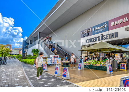 日本の東京都市景観 9月。二子玉川駅や電車、バスなどを望む