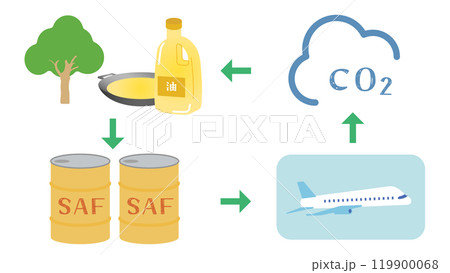 SAF-持続可能な航空燃料、ジェット機と二酸化炭素、植物由来のエネルギーのイラスト(シンプルカラー)