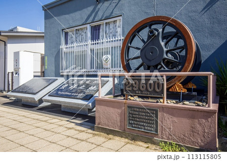 敦賀市、敦賀駅前の機関車の車輪のモニュメント