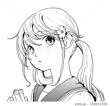 セーラー服お下げ髪のきょとんとした女の子のモノクロイラスト【線くっきり版】