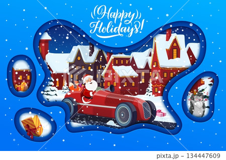 Merry Christmas and winter holidays paper cut greeting card with Santa Claus on racing car, cartoon vector. Christmas greetings with Santa driving sport car and gifts in paper cut winter town village