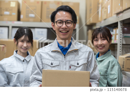 段ボールを持つ作業着姿の男性と女性2人の作業員