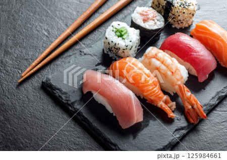 黒い石皿に並べた握り寿司_緑茶を添えて