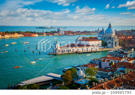 View of Venice lagoon and Santa Maria della Salute church on summer day. Venice, Italy