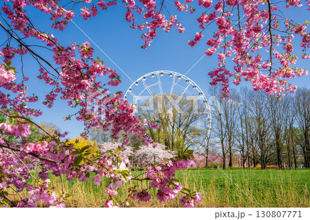 Pink sakura trees bloom in Victory Park, Riga, framing a large white Ferris wheel. A bright blue sky and green grass enhance the vibrant scene.