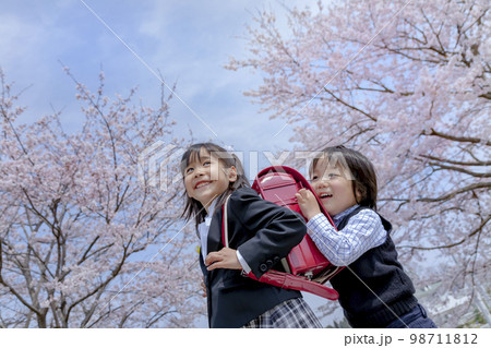 桜の咲く遊歩道を歩く入学入園の姉弟