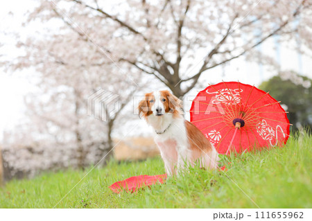 和傘で桜の花見をする中型犬コーイケルホンディエ
