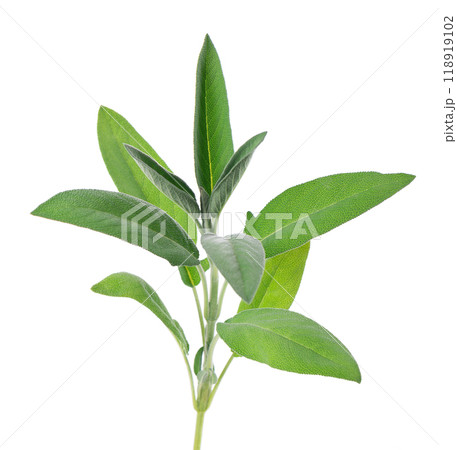 Fresh sage twig isolated on white background. Salvia Officinalis leaves. Medicinal and culinary herb. Clipping path.