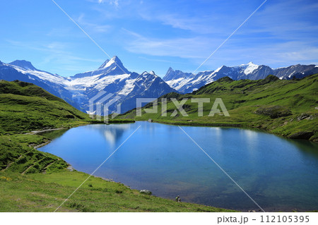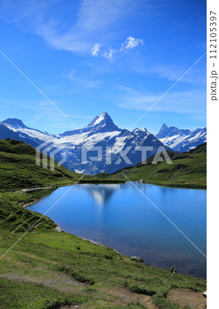 快晴の空とバッハ湖とシュレックホルン(スイス ベルン州)