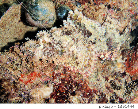 ヒリゾ浜の擬態して全く見分けがつかないオニカサゴ(フサカサゴ科)。 静岡県伊豆半島賀茂郡南伊豆町中