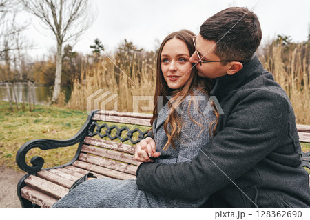 Couple enjoys a cozy moment on a park bench during a cool autumn day surrounded by nature
