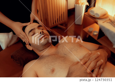Caucasian man enjoying relaxing anti-stress head massage. Quiescent