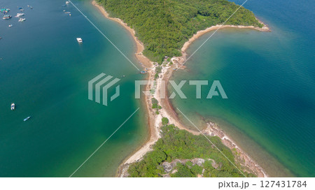 Tropical Island Coastline with Lush Forest and Turquoise Waters