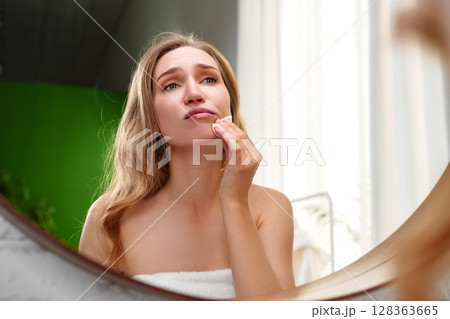 Woman applying skincare in bathrobe while looking in mirror in a bright bathroom during morning routine
