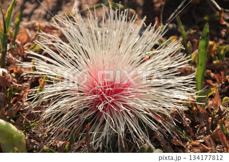 White-flowered Haemanthus in bloom, with thick green leaves and unique brush-like petals, a tropical bulbous plant from the Amaryllidaceae family.
