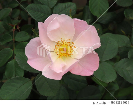 一重咲きのピンク色のバラ。シュロップシャーラス