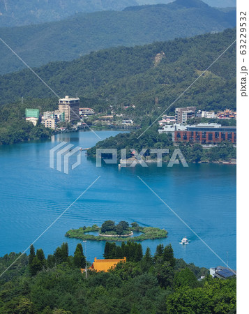 The aerial view of Sun Moon Lake with swimming pool and resort villa in Yuchi Township, Nantou, Taiwan.