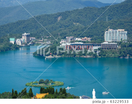 Beautiful view of a skyscraper and hotels on the shore of Sun Moon Lake in Taiwan