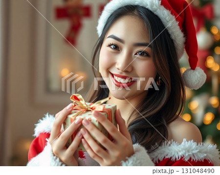 花を持つ韓国メイクをした若い女性