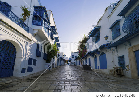 チュニジア・シディブサイド 石畳の路地と白い住宅 / Sidi Bou Said, Tunisia