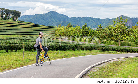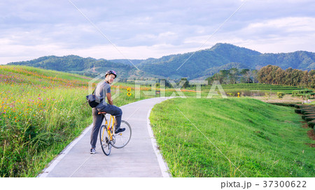 Men riding a bicycle at Singha park Chiang Rai, Thailand.