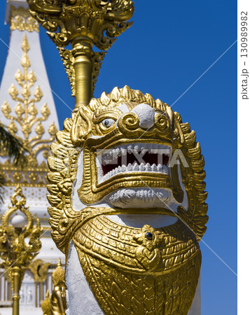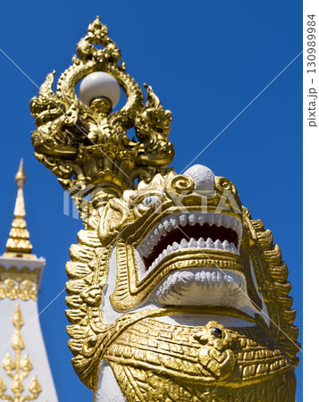 Statues of white Singha, which are animals in Thai art, decorate the front of the Church or Chapel and pagoda at Wat Den Sali Si Mueang Kaen temple. Located at Chaing Mai Province in Thailand.