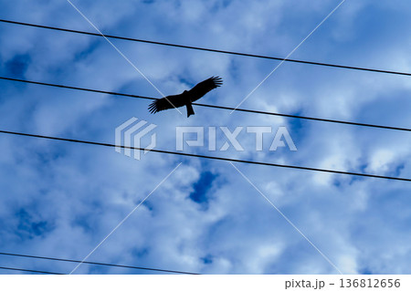 鳥のシルエット 電線 青空 飛翔 コントラスト