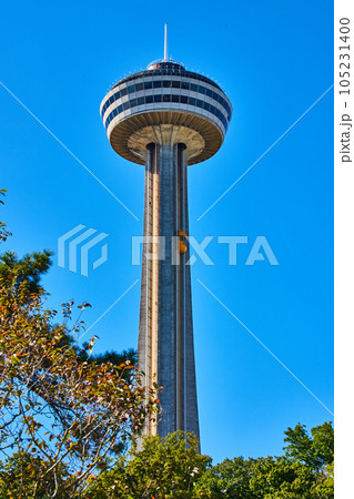 Niagara Falls looking at tall Skylon Tower in Canada with elevator on outside