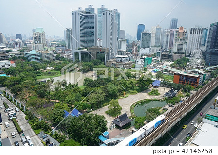 Bangkok Aerial Skyline and Skytrain view of Thailand. Business and financial building area centers with smart green park among urban city at noon time.