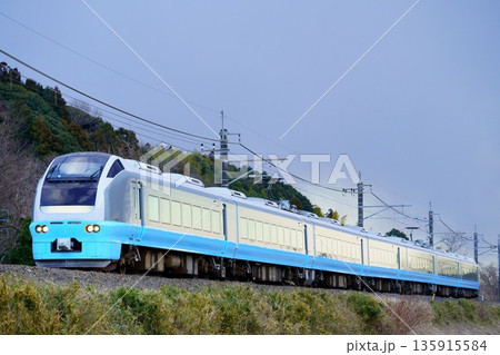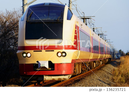 夕暮れの成田線を駆け抜けるE653系/フレッシュひたち色