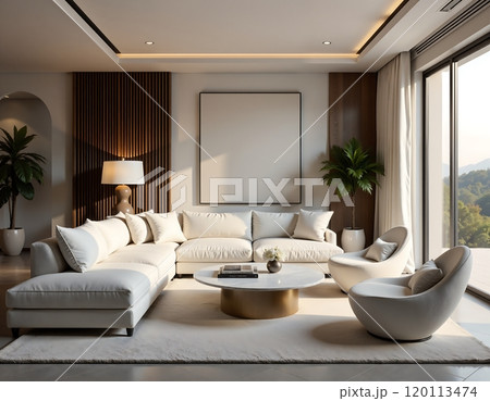 Modern minimalist living room design with elegant white furniture and large windows