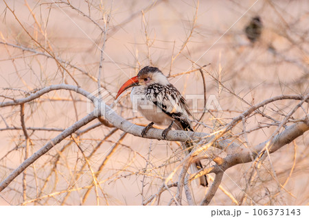 Portrait of a beautifull Northern red-billed hornbill, with huge beak sitting on the branch. Namibia. Africa