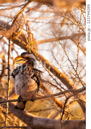 Southern yellow-billed hornbill in thornbush at dawn