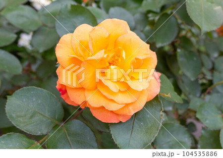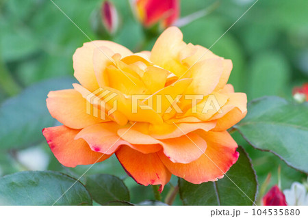 調布市深大寺元町の植物園に咲くオレンジ色のバラ(モダンローズ アンネ・フランクのバラ)の花