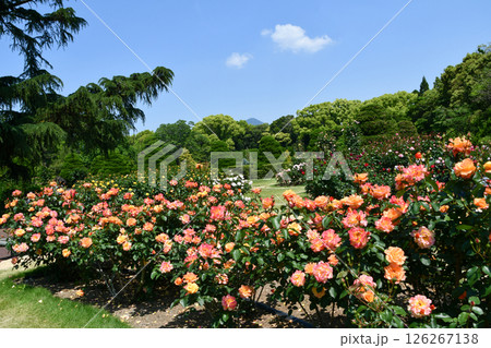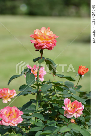 調布市の植物園に咲くオレンジとピンクアンネ・フランクのバラ