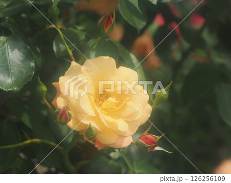 調布市深大寺元町の植物園に咲く黄色いバラ(モダンローズ アンネ・フランクのバラ)の花