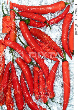 Berry background of fresh whole blueberries in water, splash of water, top view